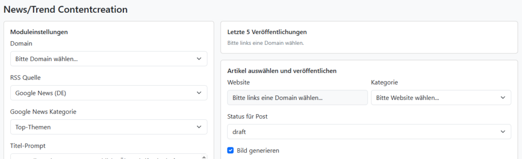 • Per KI automatisch Überschrift, Artikeltext und optional Beitragsbild erzeugen